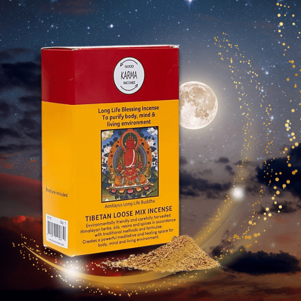Cet encens en poudre fine est préparé par des moines selon des formules sacrées dédiées aux divinités de longue vie (comme Amitayus ou Tara Blanche). Chaque ingrédient est sélectionné pour sa capacité à renforcer l’énergie vitale et à créer une atmosphère propice à la bénédiction de santé.