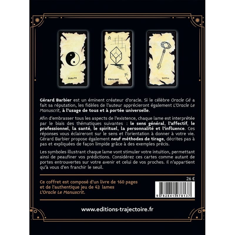 Gérard Barbier est une figure incontournable de la cartomancie. Si sa réputation s’est forgée grâce au célèbre Oracle Gé, il propose avec L’Oracle Le Manuscrit une œuvre plus intime et universelle. Ce jeu a été conçu pour accompagner aussi bien les débutants que les praticiens confirmés dans leur quête de vérité.